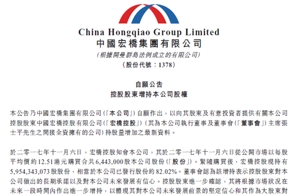 中國(guó)宏橋近日發(fā)布公告稱,其控股股東宏橋控股知會(huì)公司,將于2017年11月6日從公開(kāi)市場(chǎng)以每股均勻價(jià)約12.51港元購(gòu)置合共644.3萬(wàn)股公司股份。緊隨購(gòu)置后,宏橋控股現(xiàn)持有約59.54億股股份,相當(dāng)于公司已發(fā)行股份約82.02%。記者從公開(kāi)材料查詢后發(fā)現(xiàn),宏橋控股為公司執(zhí)行董事及董事會(huì)主席張士平間接全資具有的公司。