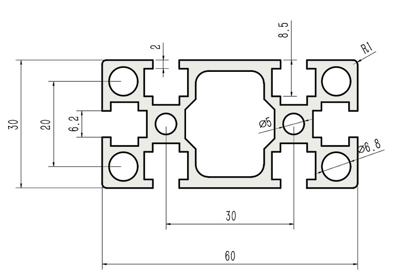 適用于應(yīng)力及強(qiáng)度較大的框架組合結(jié)構(gòu),它的外型采用直角過渡,表面經(jīng)過陽(yáng)極氧化處理,高雅美觀并抗腐蝕,它通常采用M6X20高強(qiáng)度專用螺栓的內(nèi)部連接方式,堅(jiān)固而又可靠,是工業(yè)框架應(yīng)用較為廣泛的型材之一。